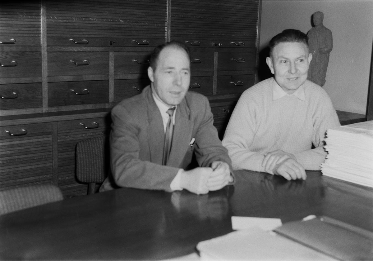 Eðvarð Sigurðsson situr við borð ásamt Hannesi Stephensen