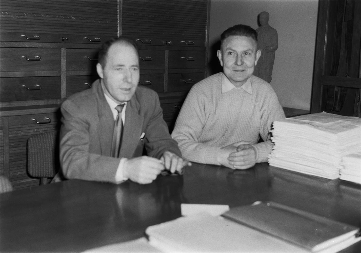Eðvarð Sigurðsson situr við borð ásamt Hannesi Stephensen
