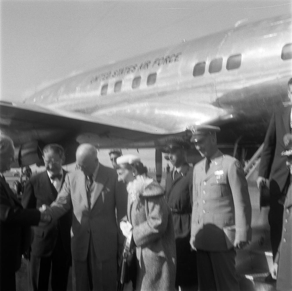 Vangasvipur á karlmanni með gleraugu, í baksýn er fólk að koma niður úr flugvél. Koma Eisenhower á Keflavíkurflugvöll