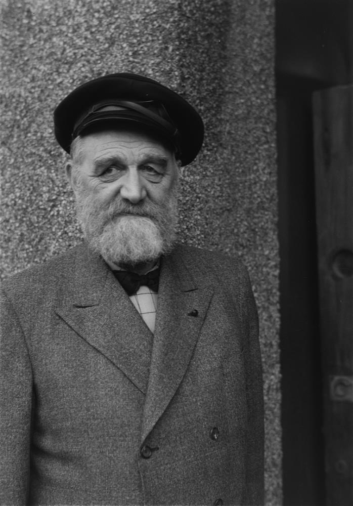 Peter Frauchen stendur við hús með hatt á höfði og horfir í myndavélina