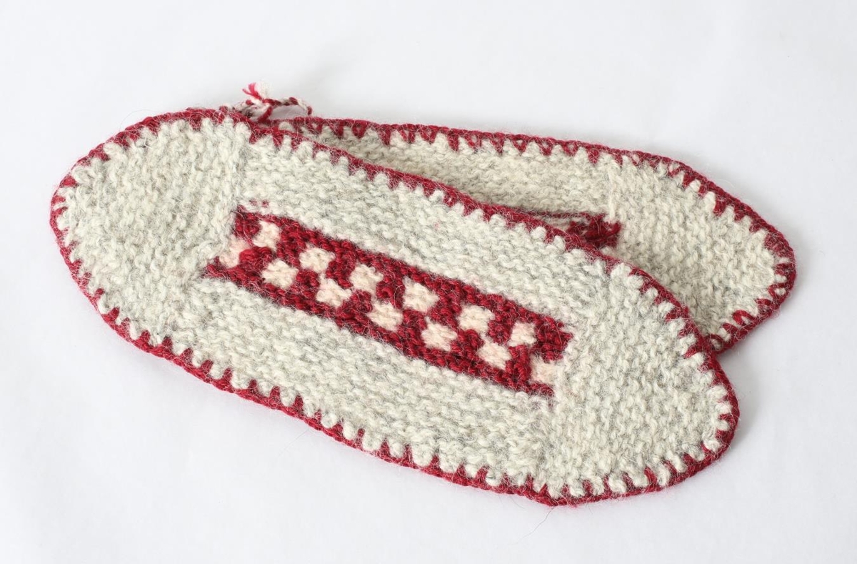 Prjónaðir íleppar í gráum og rauðum lit. Fjóla Kristjánsdóttir frá Skriðufelli prjónaði og gaf félagsstarfi aldraðra og Helga Jóna Þorkelsdóttir afhenti safninu.