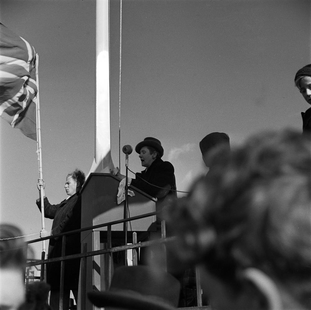 Kona heldur ræðu í púlti utandyra. Maður heldur á stöng með íslenska fánanum á toppnum í bakgrunni. Útifundur 3. apríl 1949. Myndir teknar fyrir Þjóðviljann