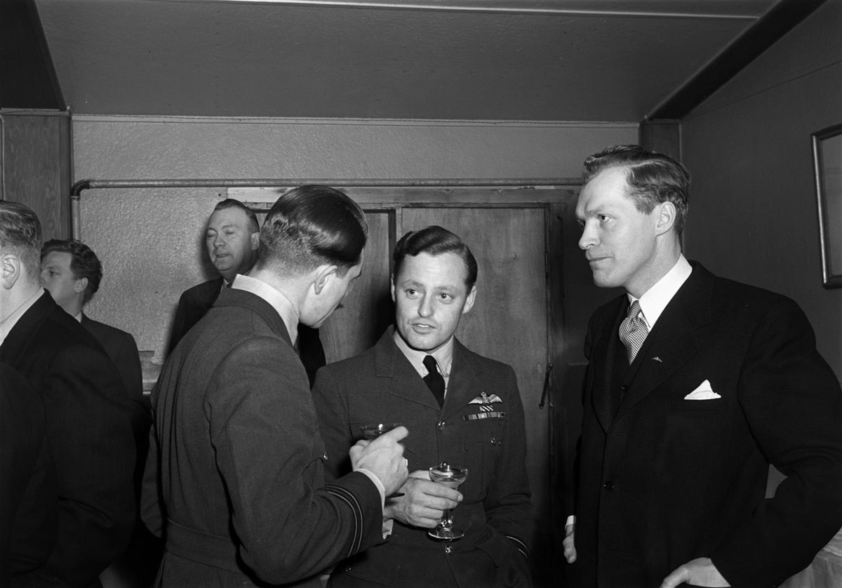 Einkennisklæddir menn ræða saman. Maður í jakkafötum stendur hjá.