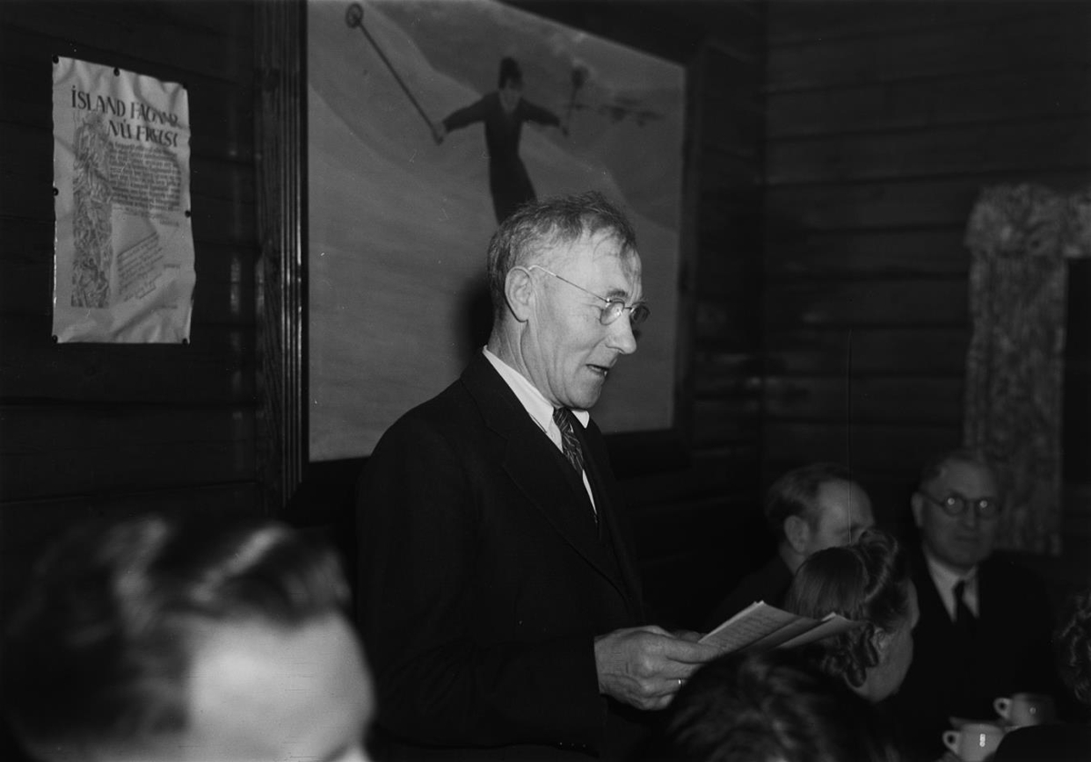 Maður heldur ræðu í afmælishófi Jóhannesar úr Kötlum. Málverk af manni á skíðum í bakgrunni. 50 ára afmælishóf Jóhannesar úr Kötlum, 1949.