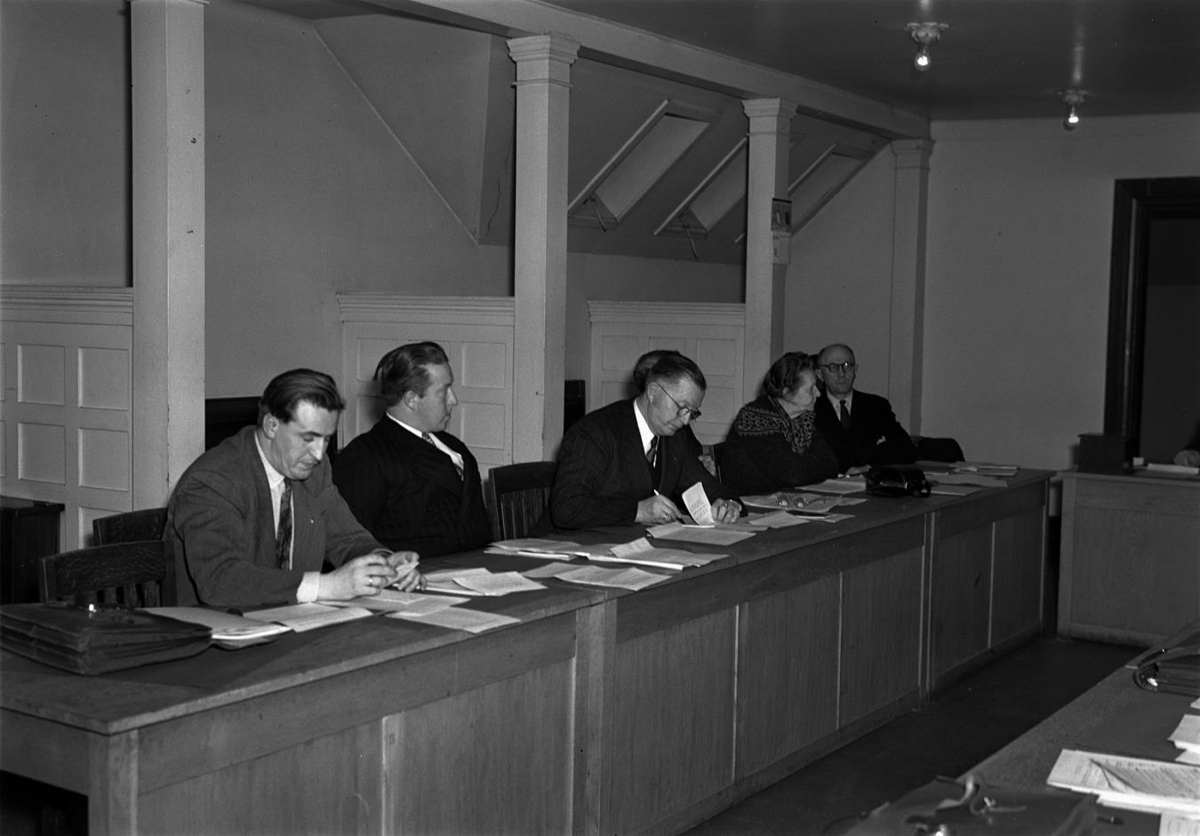 Fimm einstaklingar sitja við langt borð. Blöð á borðinu fyrir framan þau. . Bæjarstjórnarfundur.