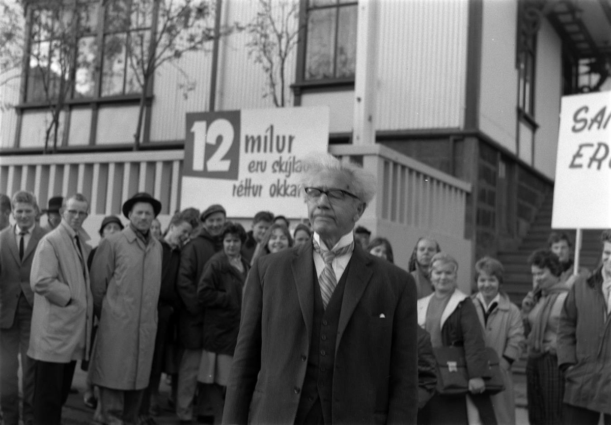 Ólafur Thors stendur fyrir utan ráðherrabústaðinn. Í bakgrunni er hópur af fólki með kröfuspjöld sem á stendur. 12 mílur eru skýlaus réttur okkar. Her og landhelgismótmælaganga árið 1960