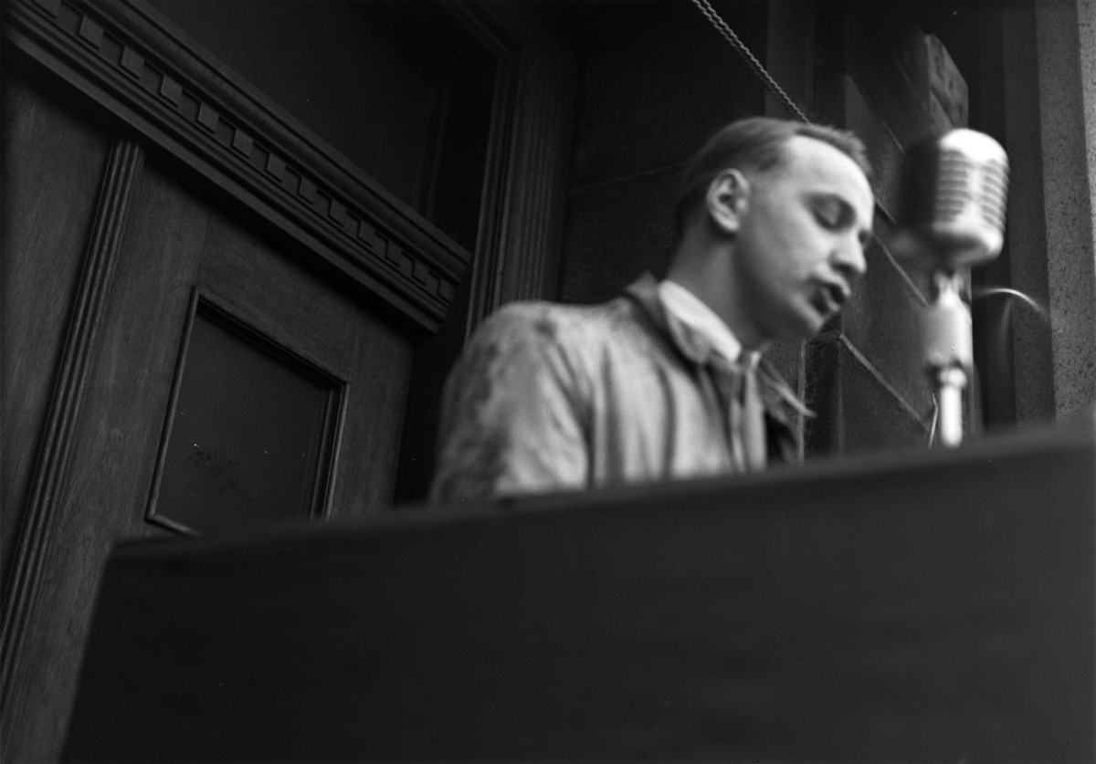 Maður heldur ræðu við púlt á útifundi á Lækjartorgi á 1. maí. Aðaldyr Útvegsbankans við Lækjartorg í bakgrunni.
