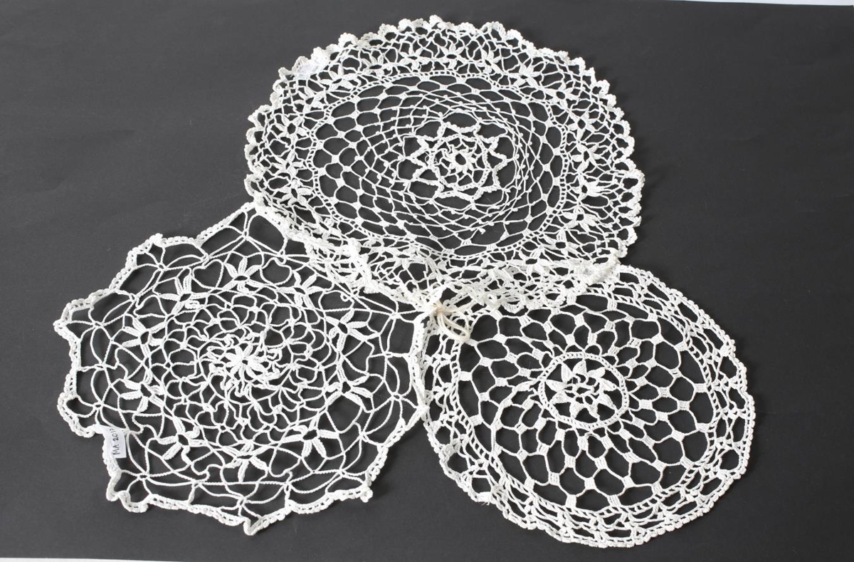 Þrjár misstórar heklaðar dúllur sem komu úr búi Alfreðs Eymundssonar frá Grófargerði. Líklegt að Helga Jónsdóttir eða Gróa Kristinsdóttir hafi heklað þetta.