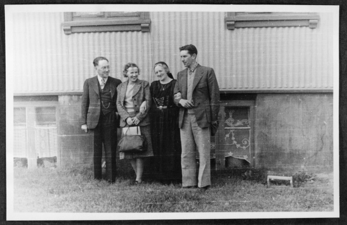 Fjórar manneskjur standa upp við húsvegg. Frá vinstri: Páll Kolka læknir, Ingibjörg Guðmundsdóttir (fósturdóttir hans), Björg Kolka (kona Páls) og Sverrir Sigurðsson (maður Ingibjargar).