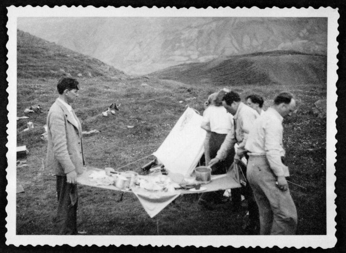 Tveir karlmenn halda á milli sín einhverskonar börum með borðbúnaði. Með myndinni stendur: Borðbúnaðnum öllum var sturtað út í vatn, svo einfalt var uppvaskið.