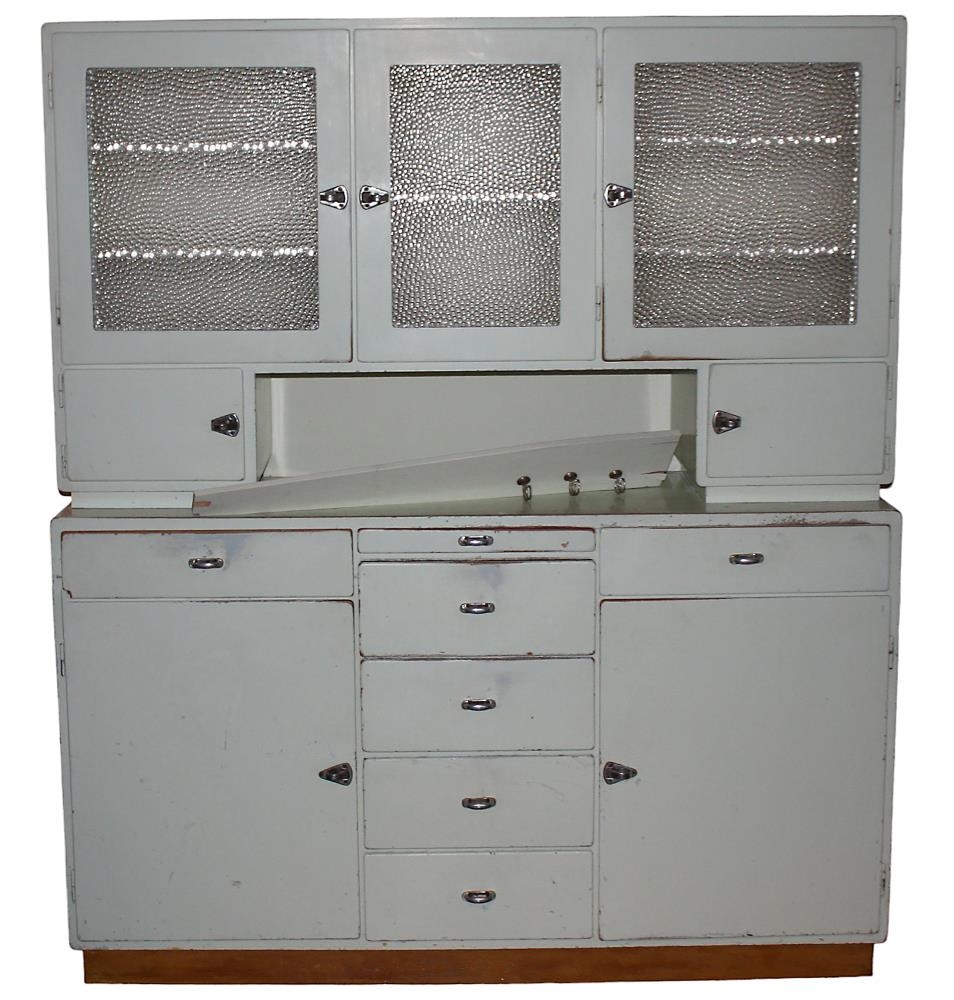Skápur-eldhússkápur, frístandandi eldhúsinnrétting, efri og neðri skápar, neðri skápur 2 hurðir skúffuröð á miðju og skurðabretti, 2 skúffur fyrir ofan hurðir. Efri skápur 3 hurðir með hönnuðu gleri og 2 litlar til hliðar, sennilega smíðuð um eða fyrir 1950. Efni: málaður krossviður mál: lengd 150 og hæð 170 (skemmtilegt eintak frá þessum tíma)