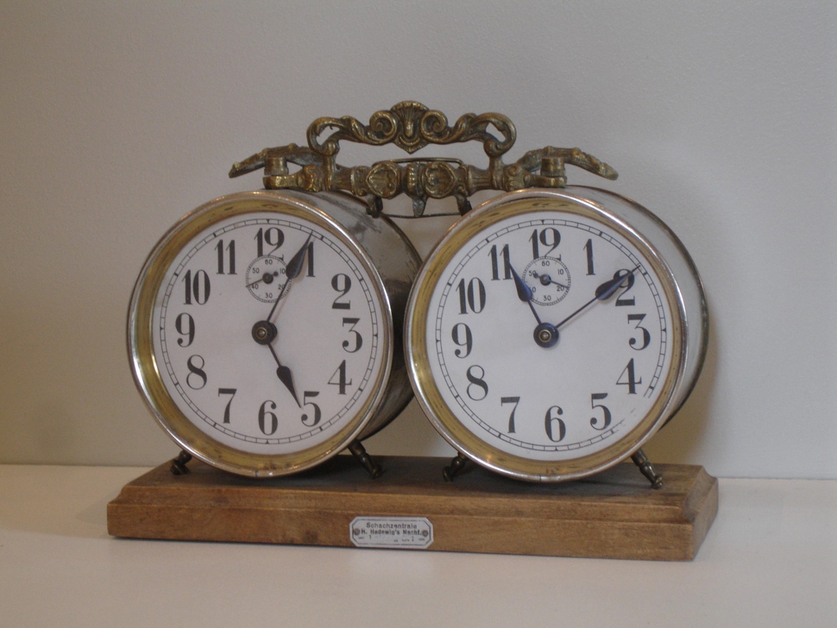 Klukkurnar standa á viðarbretti. Framan á brettinu er lítil málmplata með áletruninni: "Scachzentrale H. Hedewig´s Nachf." , neðst hefur staðið eitthvað fleira en það er máð (gæti verið "Leipzig C.1").