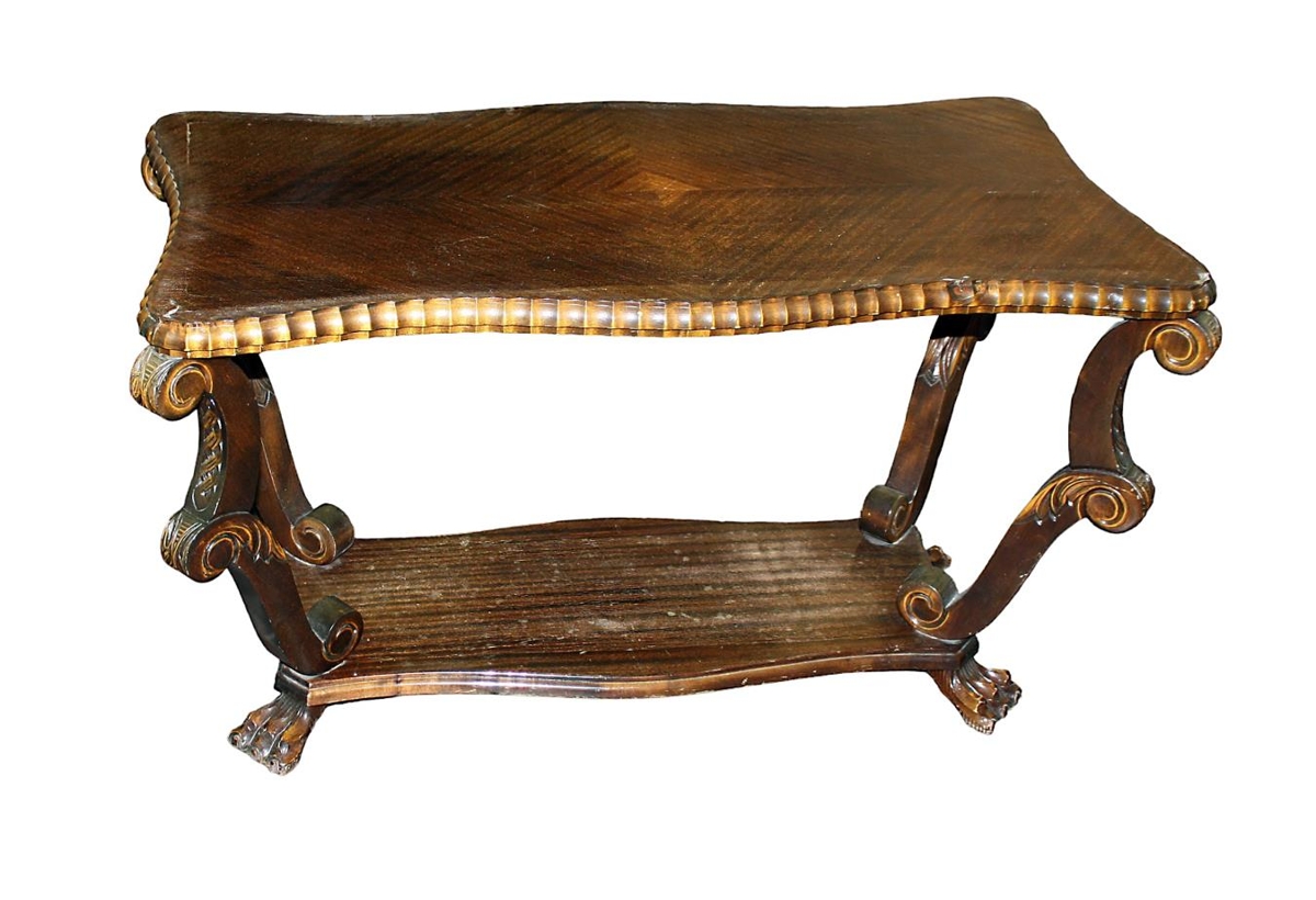 Sófaborðið er íslensk smíð en ekki vitað hver smíðaði. Borðið er brúnleitum harðvið, útskornar fætur og glerplata.