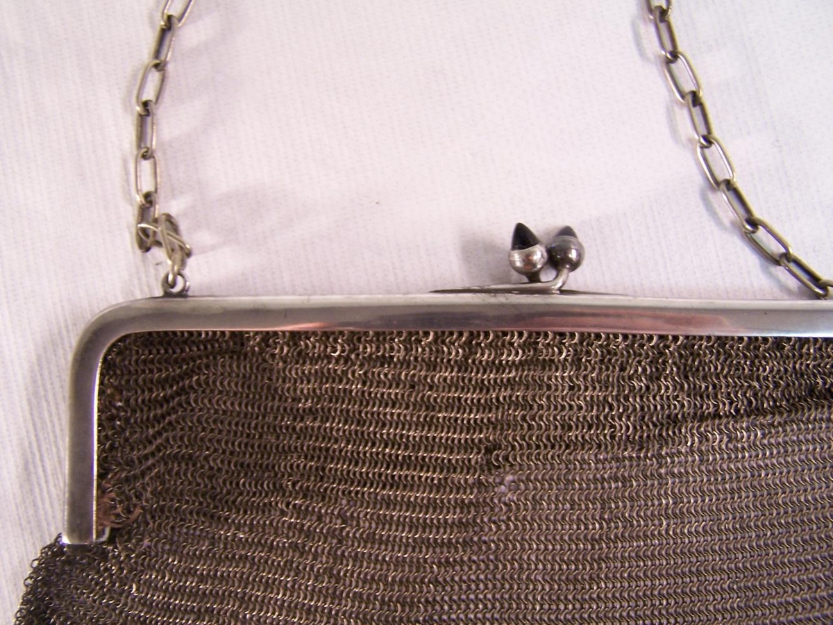 Dömuveski, úr málmi með keðju til að hengja á öxl. Lokað með krækju, í henni eru bláir steinar. Með veskinu fylgdi eftirfarandi texti: Selskapsveski frá Breiðuvík á TJörnesi. Benedikt Benediktsson (1859-1979) fékk þetta selskapsveski í vöruskiptum í franskri fiskveiðiskútu fyrir prjónales, ullarsokkar, vettlinga og handofnar værðarvoðir á árunum 1916-1920. Kemur úr dánarbúi dóttur hans Ingibjargar Benediktsdóttur (1900-1988), húsmóður og saumakonu á Akureyri.