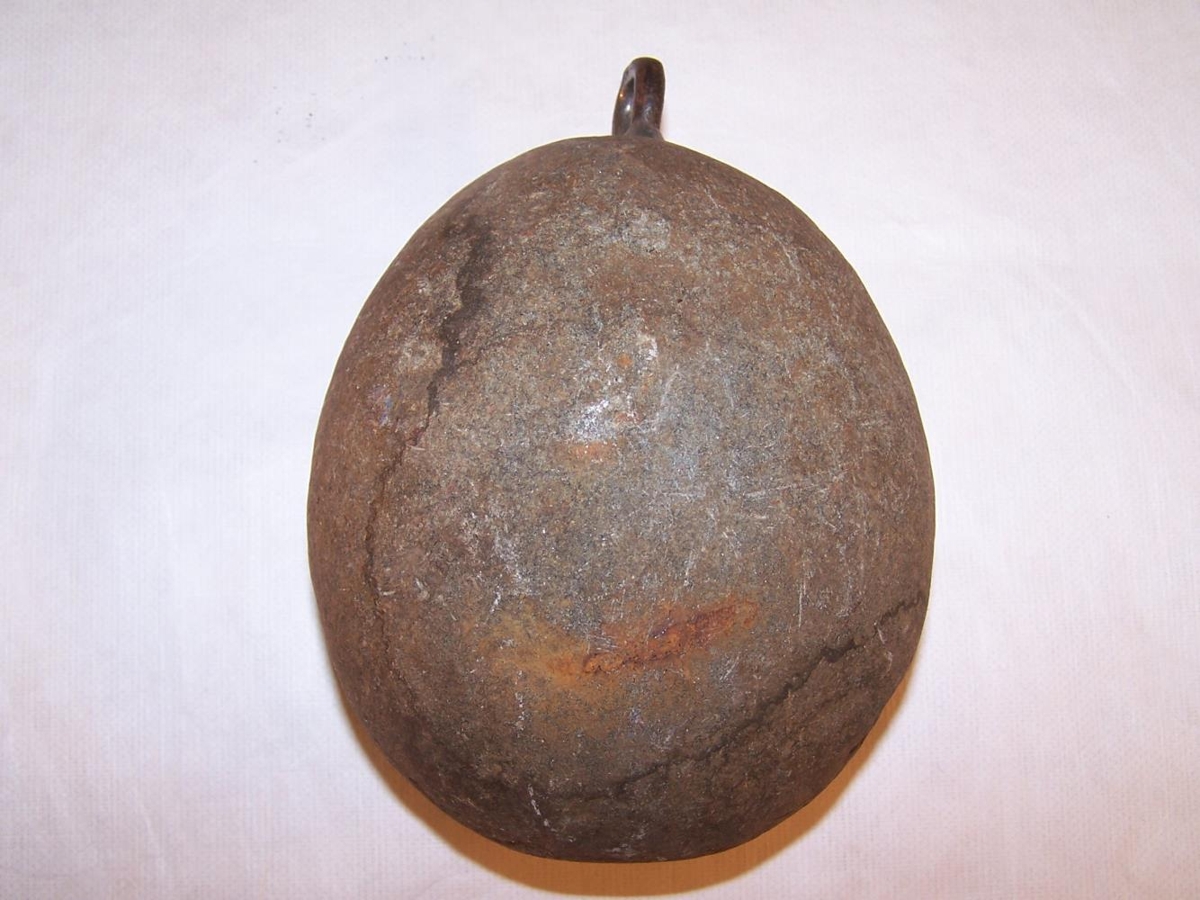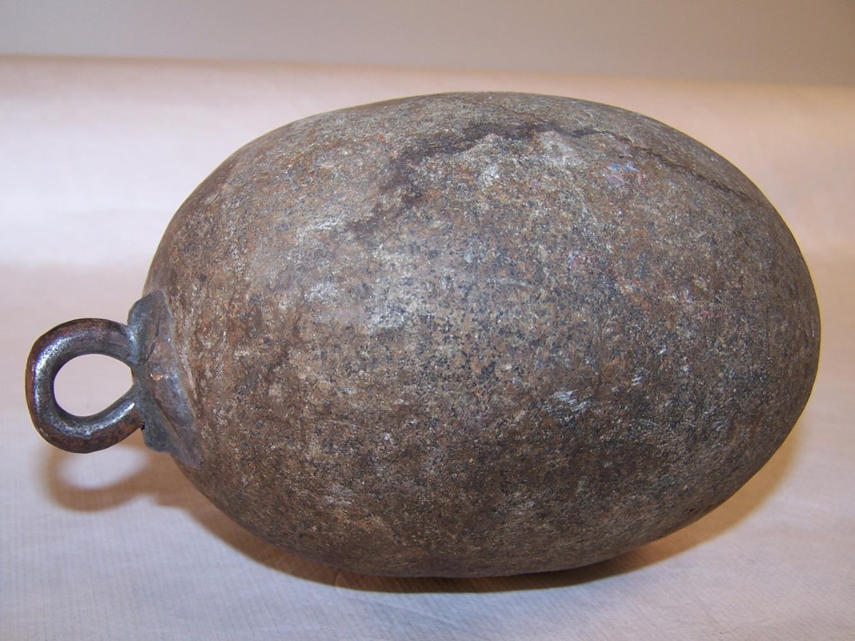 Steinlóð, með járnhring til að hengja lóðið á reislu. Kom með reislu nr. 2017-9.