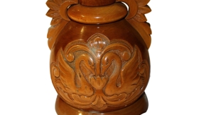Borðlampi með ljósaskerm. Fótur lampans er úr tré og fagurlega útskorinn af Helga Angantýssyni mynskurðameistara í Reykjavík. Átti Sína Ásbjörnsdóttir Arndal, dóttir Ásbjörns Sigurðssonar frá Melbæ á Akranesi, til heimilis að Sólvangi (dvalarheimili aldraða) Hafnarfirði. Gefið safninu í sept. 1980. Gjöf til Sínu frá Borgfirðingafélaginu í Reykjavík.