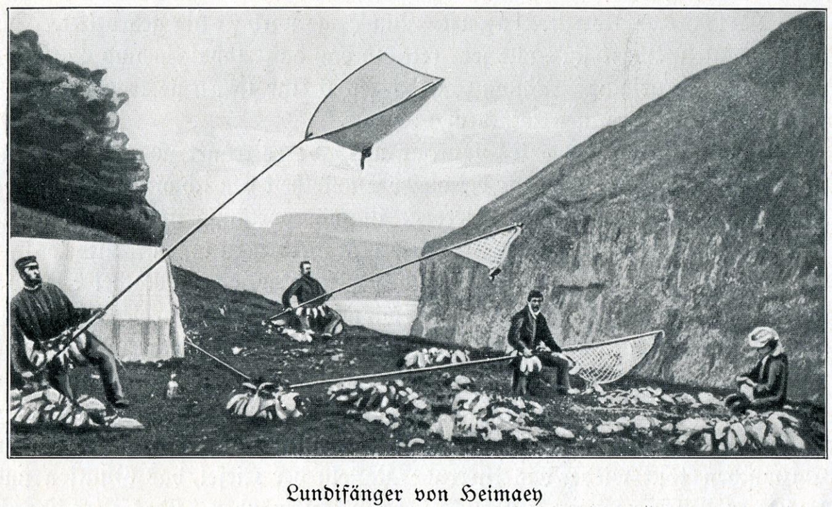 Lundaveiðimenn við lundaveiðar með háfum, fjöldi fugla liggur í kippum á jörðinni. Í baksýn t.h. sér i Heimaklett. Undir myndinn stendur: Lundifänger von Heimaey.