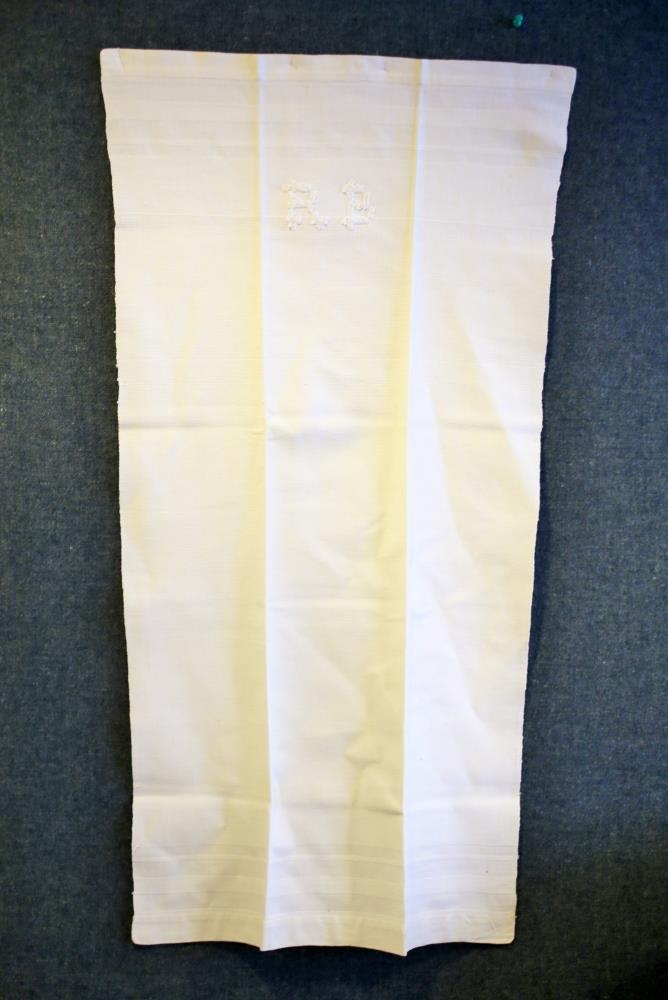 Ofið handklæði úr hvítum hör. Stafirnir R.B. er uppdreginir úr vefnaðinum. Rósa hefur ofið þetta handklæði og kom þetta úr búi hennar.