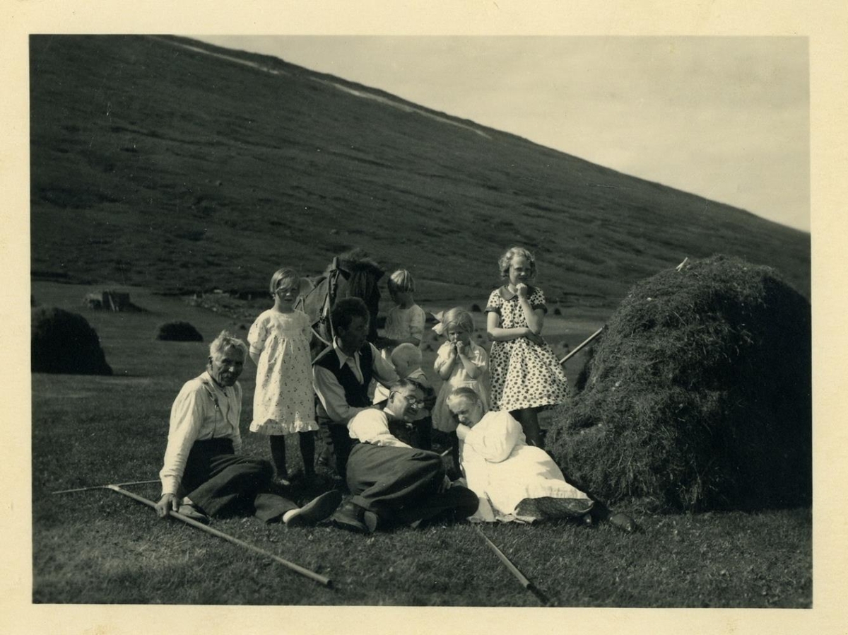 Hópur fólks á ýmsum aldri situr á túni þar sem verið er að hirða hey og setja upp í litla hgalta. Hjá hópnum stendur hestur sem tvær telpur halda við. Á bakhlið er skrifað: Á túninu á Stóru-völlum í Bárðardal. Ca. 1937 ? Neðst t.v. er prentað eða skrifað með tússi: WALTER JWAN SOMMER 1937.