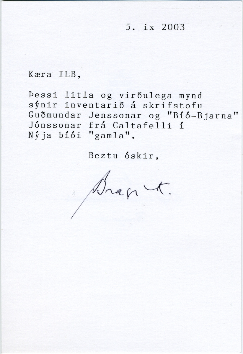 Með fylgir spjald sem á er skrifað: „Þessi litla og virðulega mynd sýnir inventarið á skrifstofu Guðmundar Jenssonar og „Bíó-Bjarna“ Jónssonar frá Galtafelli í Nýja bíói „gamla“.“ Bragi K.