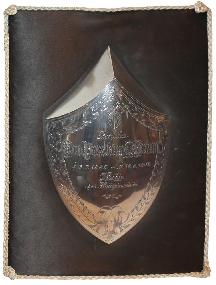 Minningarskjöldur um sr.Þorsteinn Briem ( f.1885-d.1949) Sr. Þorsteinn Briem var prestur í Garðaprestakalli á Akranesi 1921-1946 og prófastur Borgafjarðarprófast frá árinu 1931.Þetta er silfur skjöldur flatur með áletrun.óvíst hver gaf.