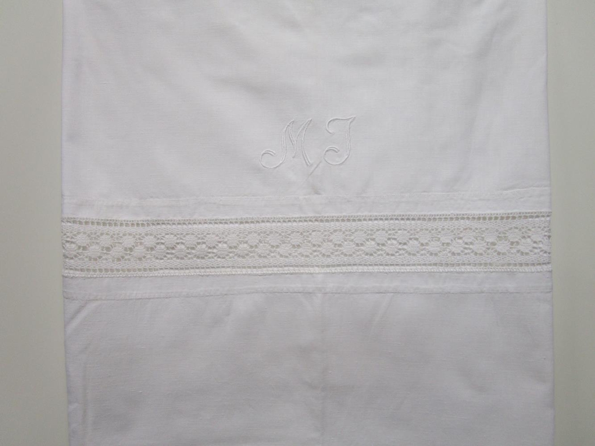 Sængurver með blúndumilliverki sem Matthildur Jóhannesdóttir húsfreyja á Hofstöðum í Miklaholtshreppi saumaði. Sængurverið er merkt með fangamarki Matthildar.
