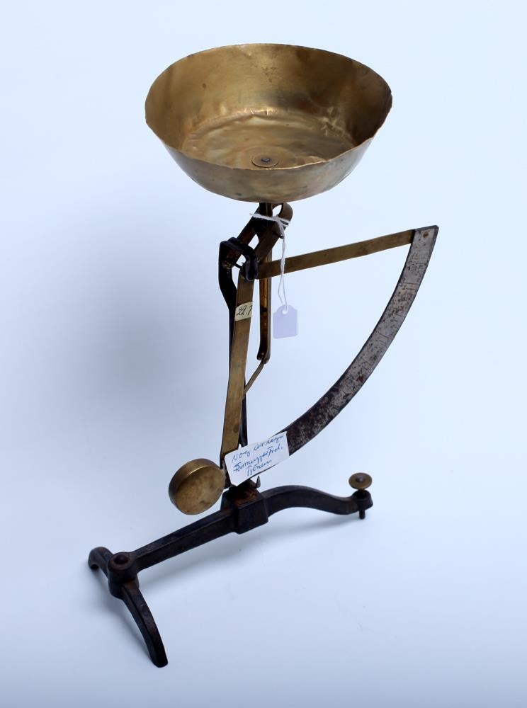 Svört og gyllt málmvog á þremur fótum aflöng. Mæliskálin laus.