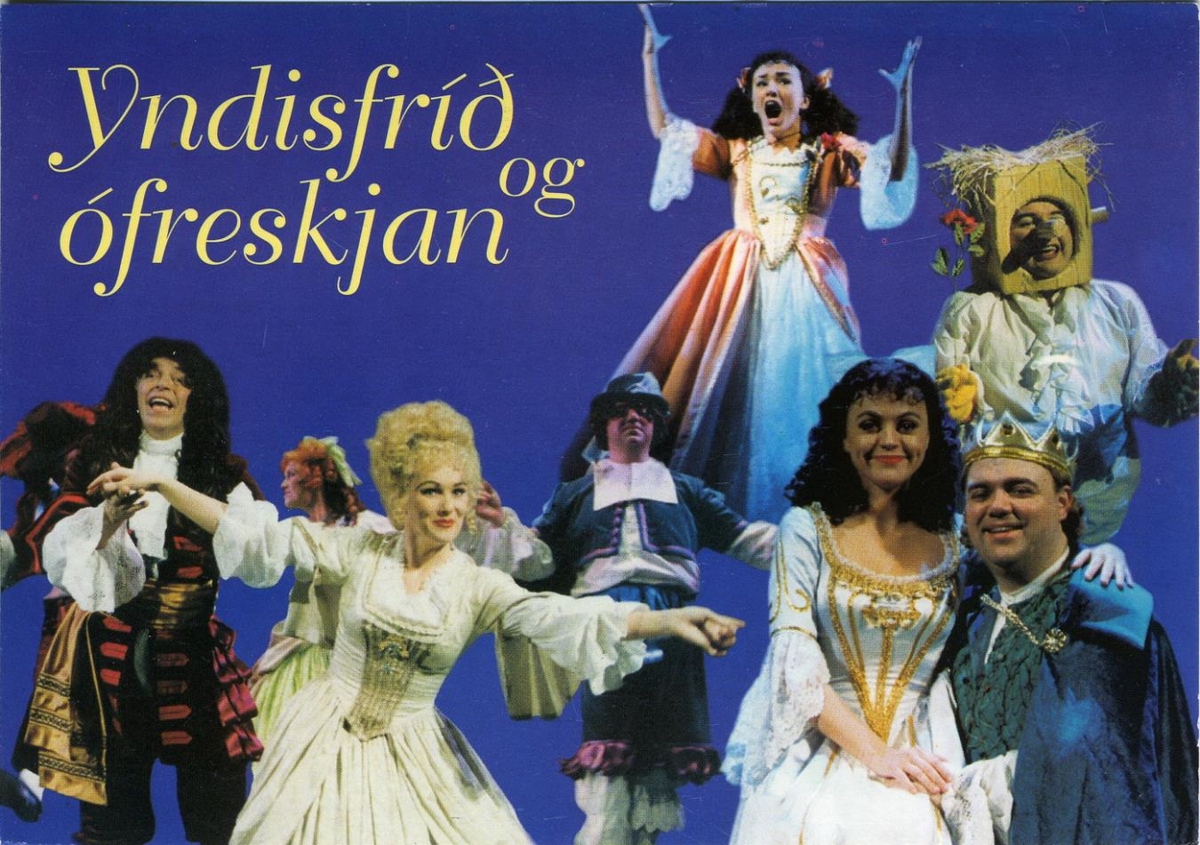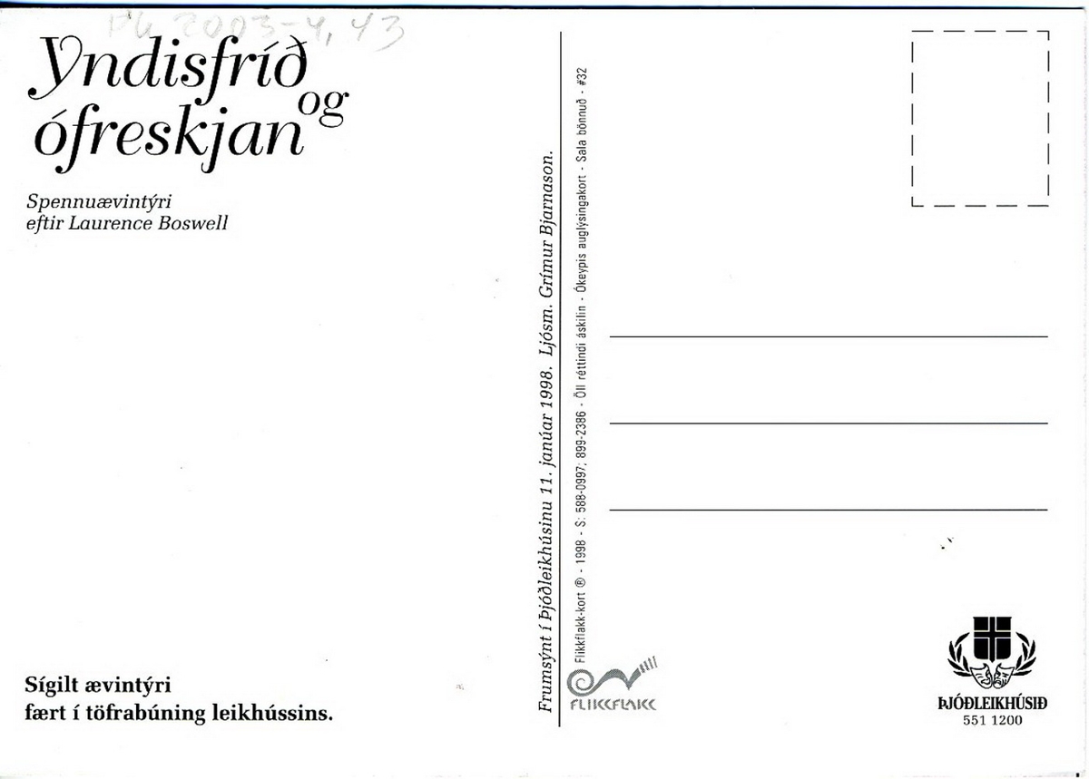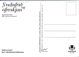 Hópur leikara í leikbúningum. Texti: Yndisfríð og ófreskjan. Á bakhlið m.a.: Spennuævintýri eftir Laurence Boswell. Frumsýnt í Þjóðleikhúsinu.. / Flikkflakk-kort 1998 / #32.