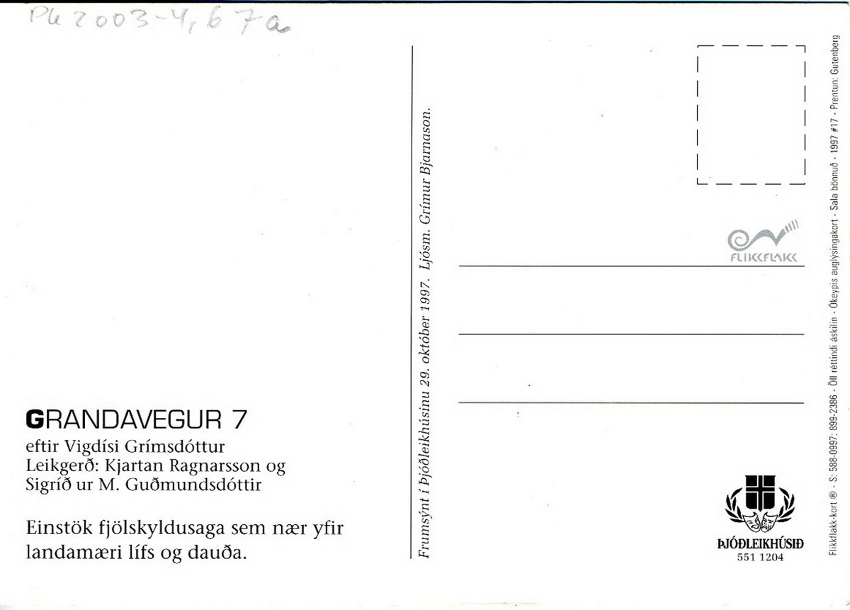 Kona stendur í fjöru og er skópörum af öllu tagi raðað henni til beggja handa. Á bakhlið m.a.: Grandavegur 7 eftir Vigdísi Grímsdóttur.. / Frumsýnd í Þjóðleikhúsinu 29. október 1997. Ljósm. Grímur Bjarnason. / Þjóðleikhúsið / Flikkflakk-kort 1997 / #17.