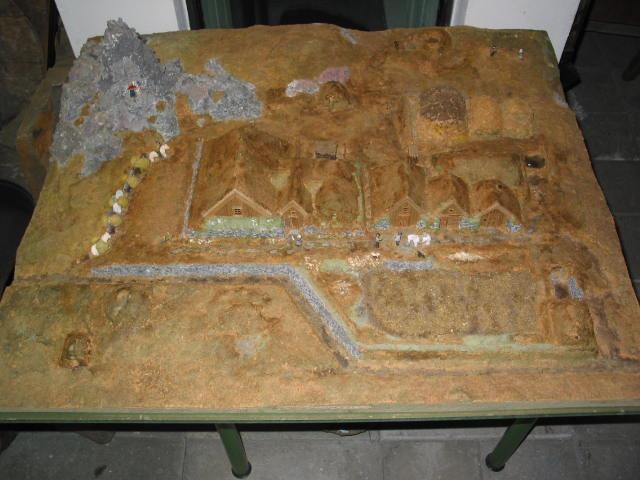 Líkan af íslensku sveitabýli.Líkanið er unnið úr trétexi og eldspýtnastokkum,að mestu leyti í apríl 1960 af sr.Jóni M.Guðjónssyni og gefið byggðasafninu.