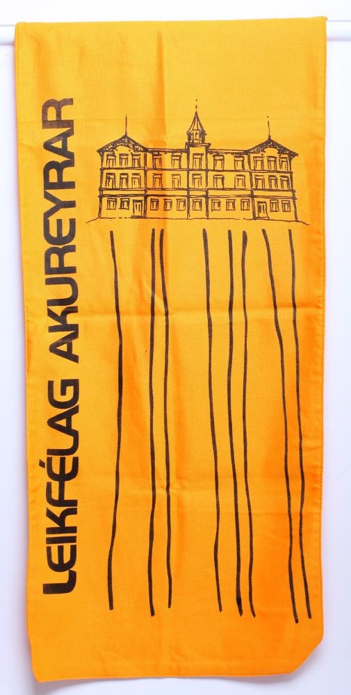Appelsýnugulur fáni merktur Leikfélag Akureyrar með mynd af Samkomuhúsinu.