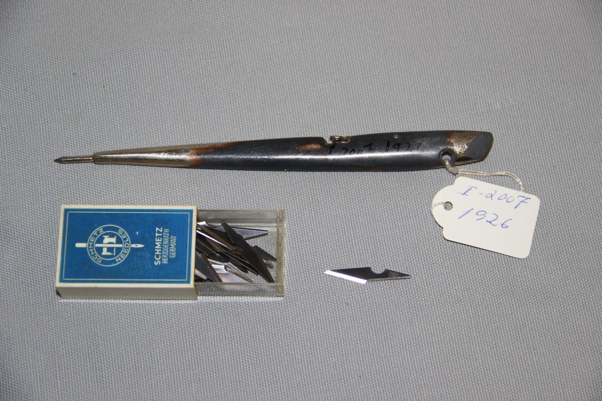 Hnífurinn er gráleitur með spennitakka þegar skipta skal um blað. Kassinn er hvítur og blár og í honum eru 31 blað. Stærð kassans: 5x3x1,5 cm.
