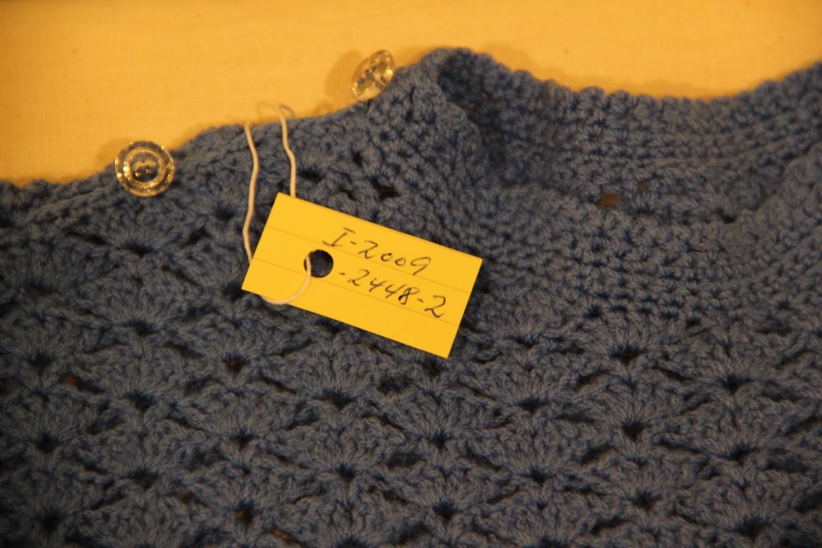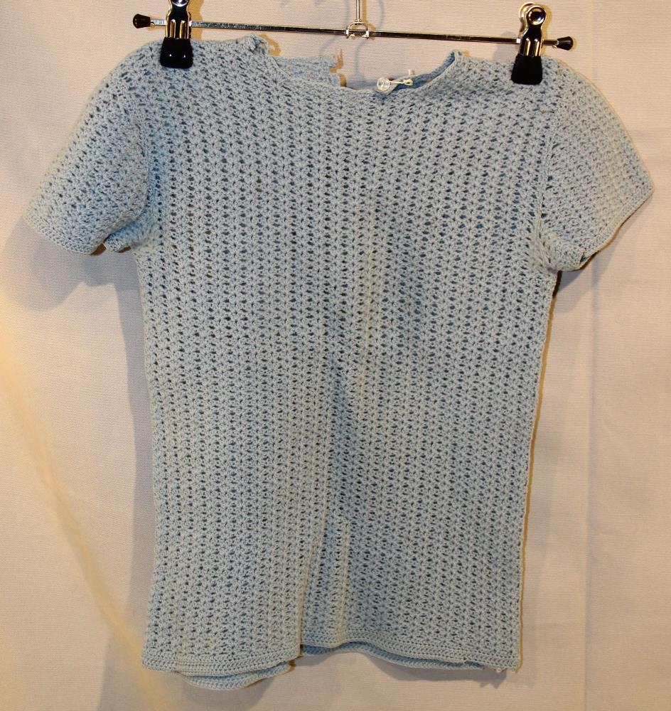 1. Ljósblá barnapeysa, hneppt að ofan og stutterma.