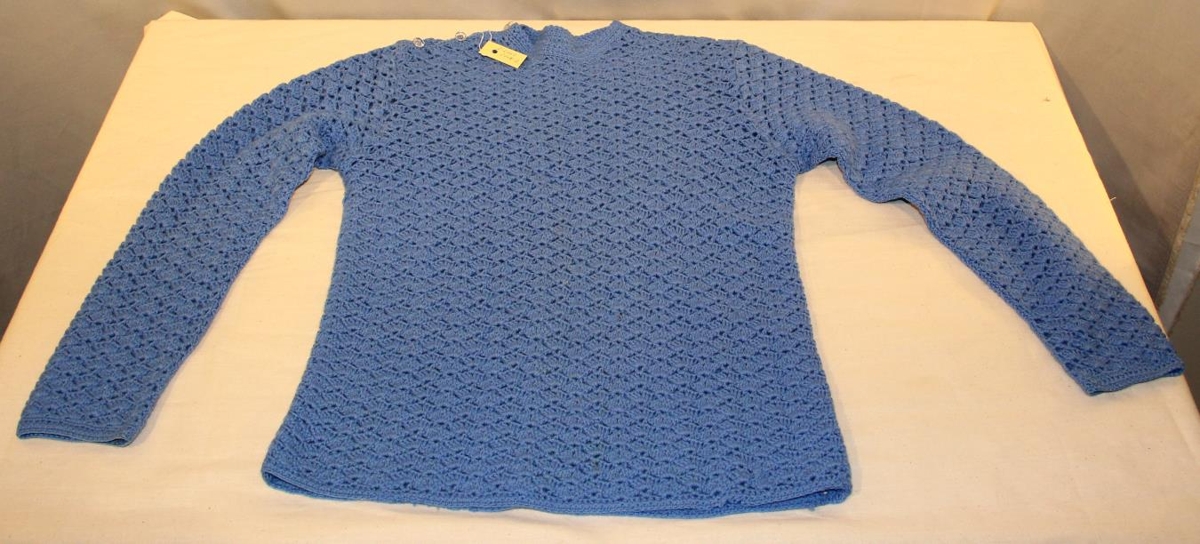 2. Blá barnapeysa, hneppt á öxl og langerma.