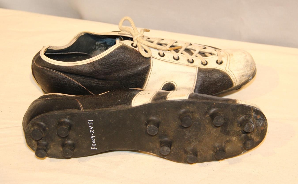 Skórnir eru hvítir og svartir, reimaðir og með takkasóla úr næloni. Í sóla stendur: Greyhound. Stærð: 42.