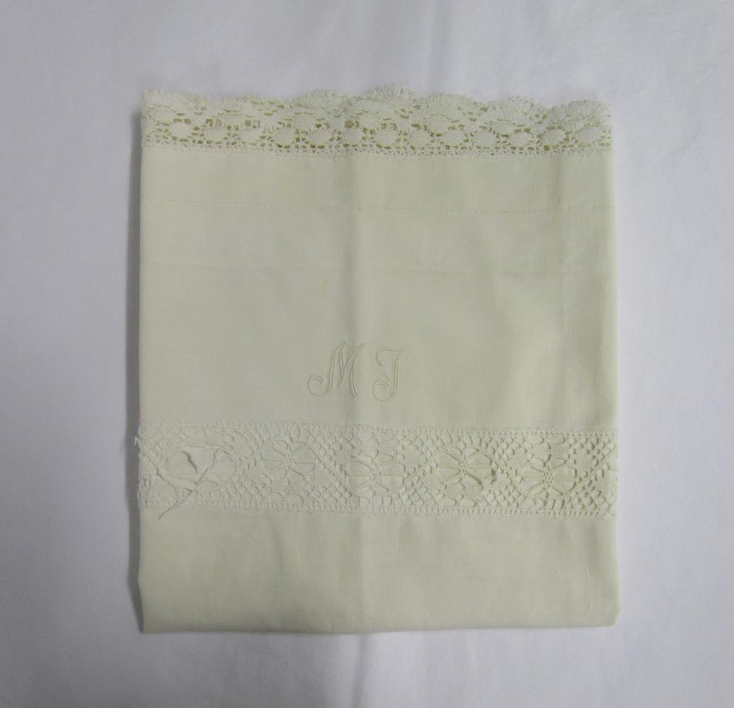 Hvítt koddaver sem orðið er nokkuð gulnað og slitið. Milliverkið er bómullarblúnda og einnig er bómullarblúnda utan með. Fangamarkið M J er vélsaumað.