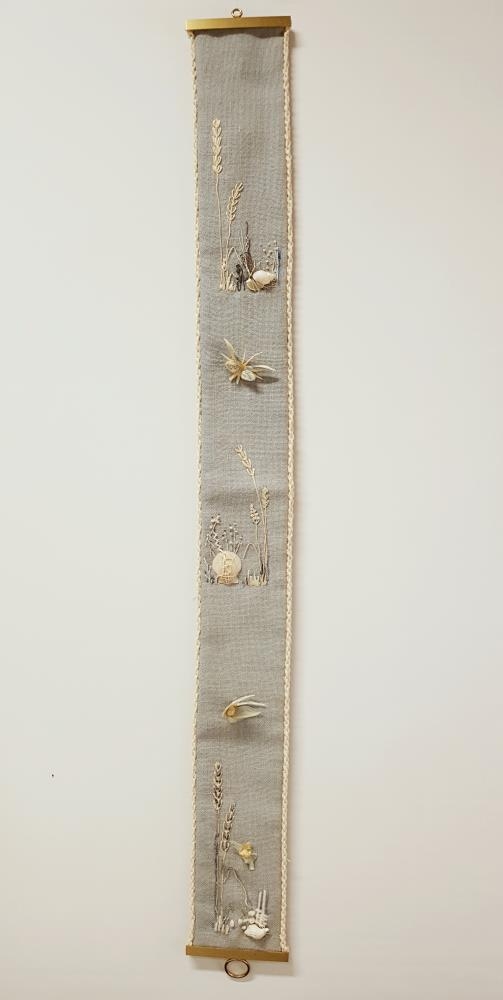 Ljósblár klukkustrengur með hvítum útsaumi. Myndefnið eru strá og blóm útsaumuð með tveimur ólíkum hvítum þráðum og á litlu svæði er dökkbrúnn þráður notaður. A tveimur stöðum eru kuðungar þræddir inní blómamynstrið og á einum stað er lítil hörpuskel. Blá handlituð fiskibein eru látin mynda þrjú fiðrildi á klukkustrengnum, það minnsta er þrætt fast á strammann, eitt nælt með nælu ogh það þriðja fest með lími. Hvít snúra er meðfram langhlið og gylltar festingar á hvorum enda. Pennastrik þar sem mynstrið var teiknað á strammann er sjáanlegt á mörgum stöðum. Stramminn sjálfur hefur gulnað sökum aldurs. Allar líkur eru á aðHlega hafi gert klukkustrenginn en hún hafði oft notað skeljar og bein t.d. við gerð leikbúninga.