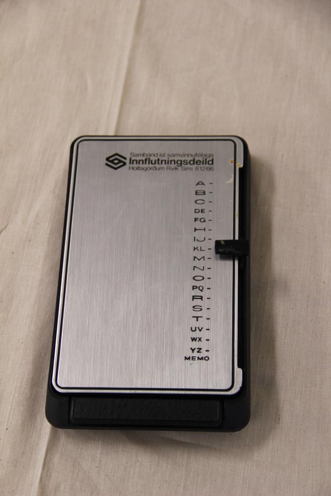 Símaskrá í plastboxi sem er svart með silfurlitu loki úr járni. Á lokinu er merki Sambands íslenskra samvinnufélaga (SÍS) og textinn: Samband íslenskra samvinnufélaga - Innflutningsdeild - Holtagörðum Reykjavík. Símaskráin var í notkun hjá Bústólpa á Akureyri.