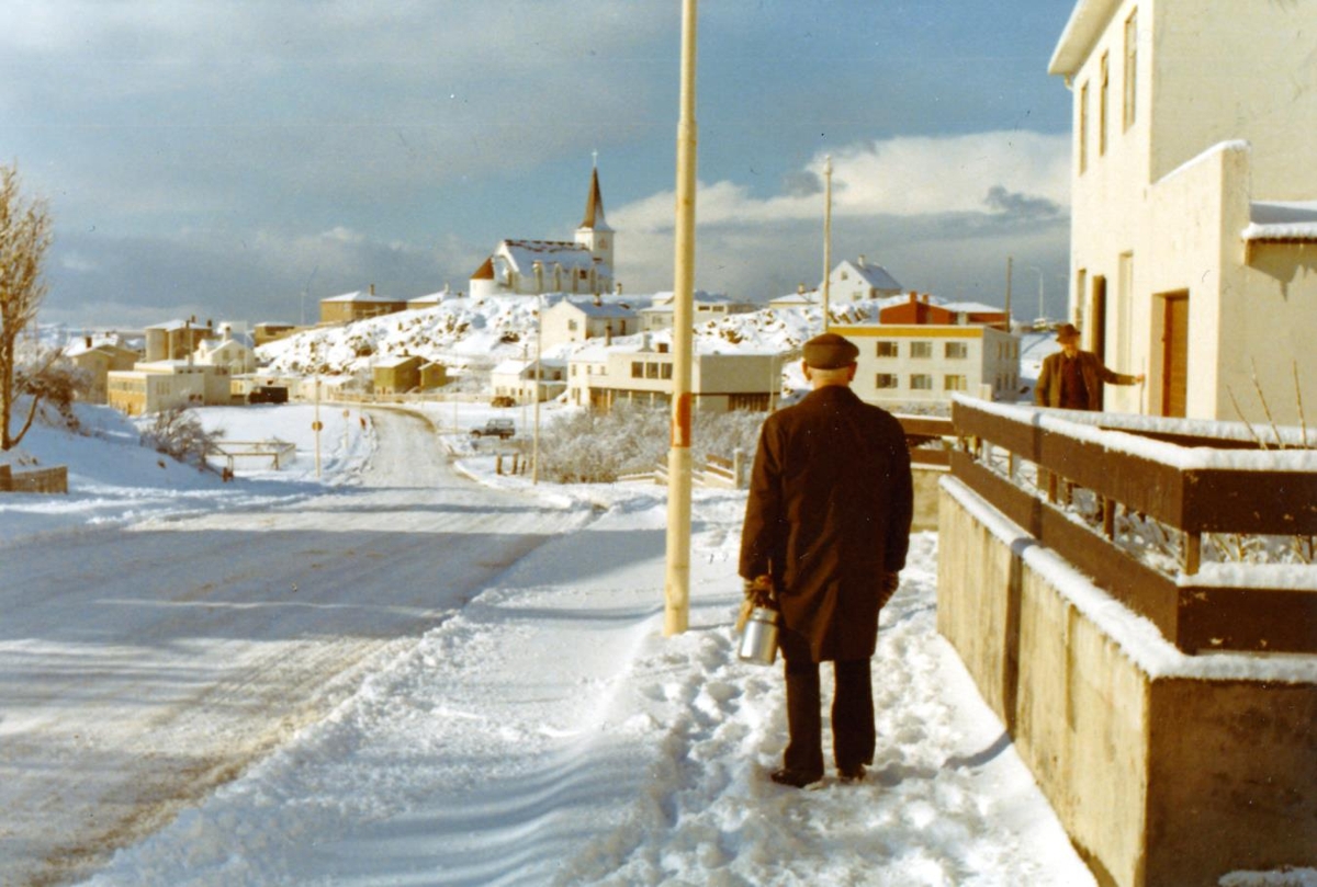Stefán Ólafsson skósmiður stendur með mjólkurbrúsa í hendi og snýr baki í myndavélina. Oddur Búason stendur fyrir utan húsið sitt. Við vitum að myndin var tekin fyrir 1986, en Stefán lést það ár. Friðjón Sveinbjörnsson sparisjóðsstjóri tók myndina.