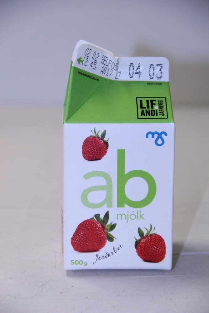Hvít pappaferna undan Ab-mjólk. Fernan er með grænni rönd efst, grænum texta og myndir af jarðarberjum. Texti: ms Ab-mjólk - Jarðarber.