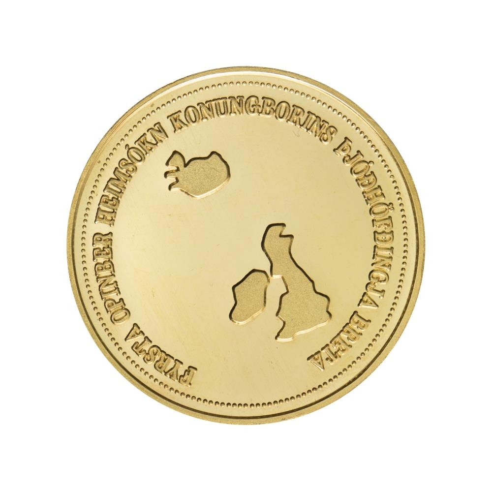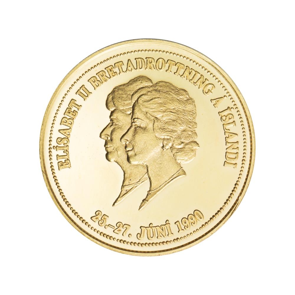Þessi minnispeningur var búinn til af Ernu gull og silfursmiðju í tilefni af opinberar heimsóknar Elísabetar II Englandsdrottningar og Filipusar prins til íslands arið 1990.