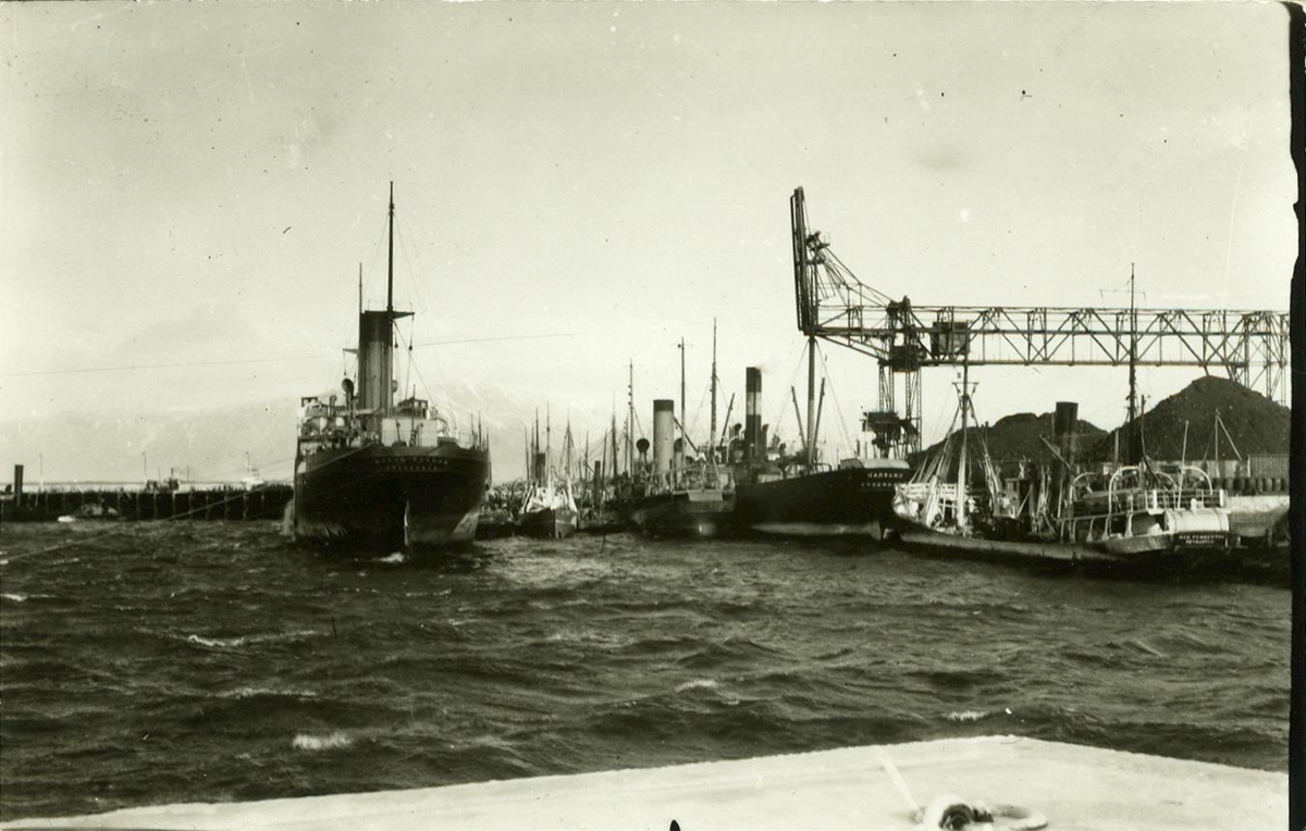 Horft í norður yfir Reykjavíkurhöfn. Kolakraninn hægra megin á myndinni. Skip merkt BARON BRANAN OG HADSUND í höfn.
