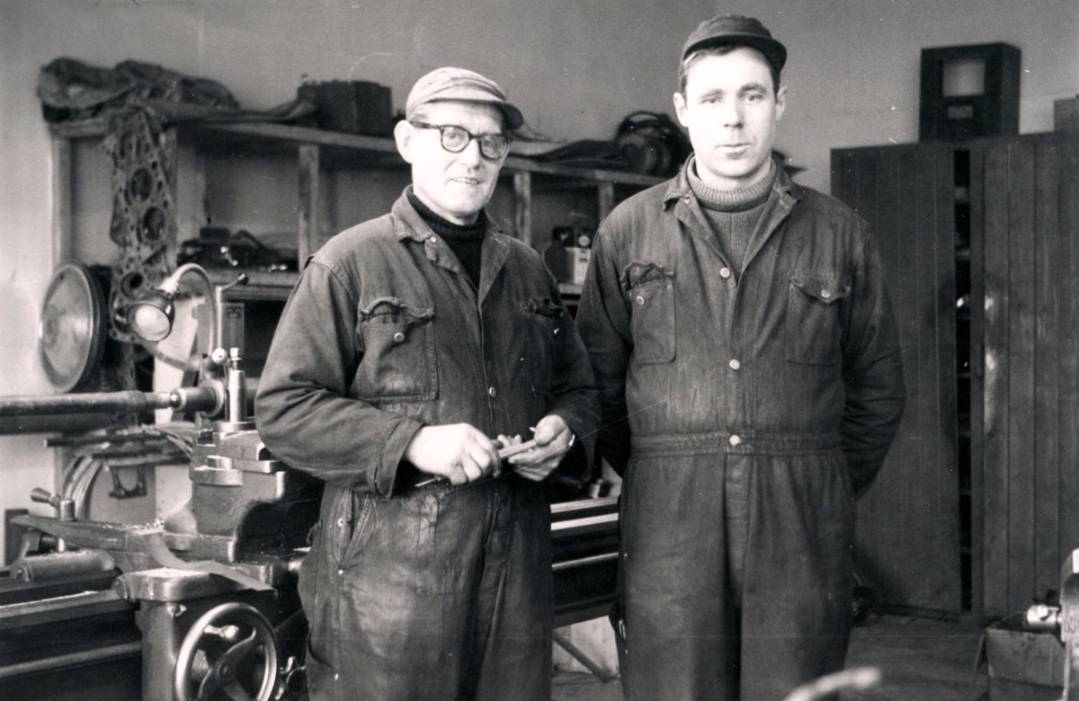 Ásbjörn Jónsson og Guðmundur Jónsson uppi á lofti BTB (Bifreiða og Trésmiðju Borgarness).