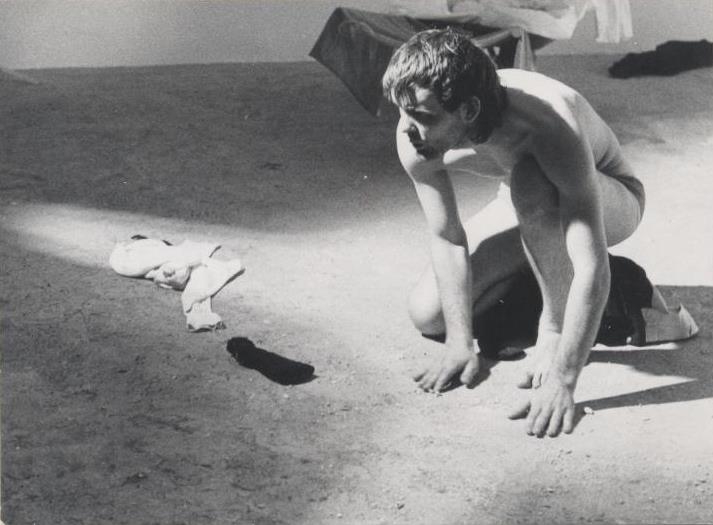 Maður krípur í sandi á hnjánum með hendur fyrir framan sig. Á fletinum þar sem maðurinn krípur er ljós / birta, við hlið hans framarlega eru föt og nánast fyrir aftan hann eru föt og kannski stóll.