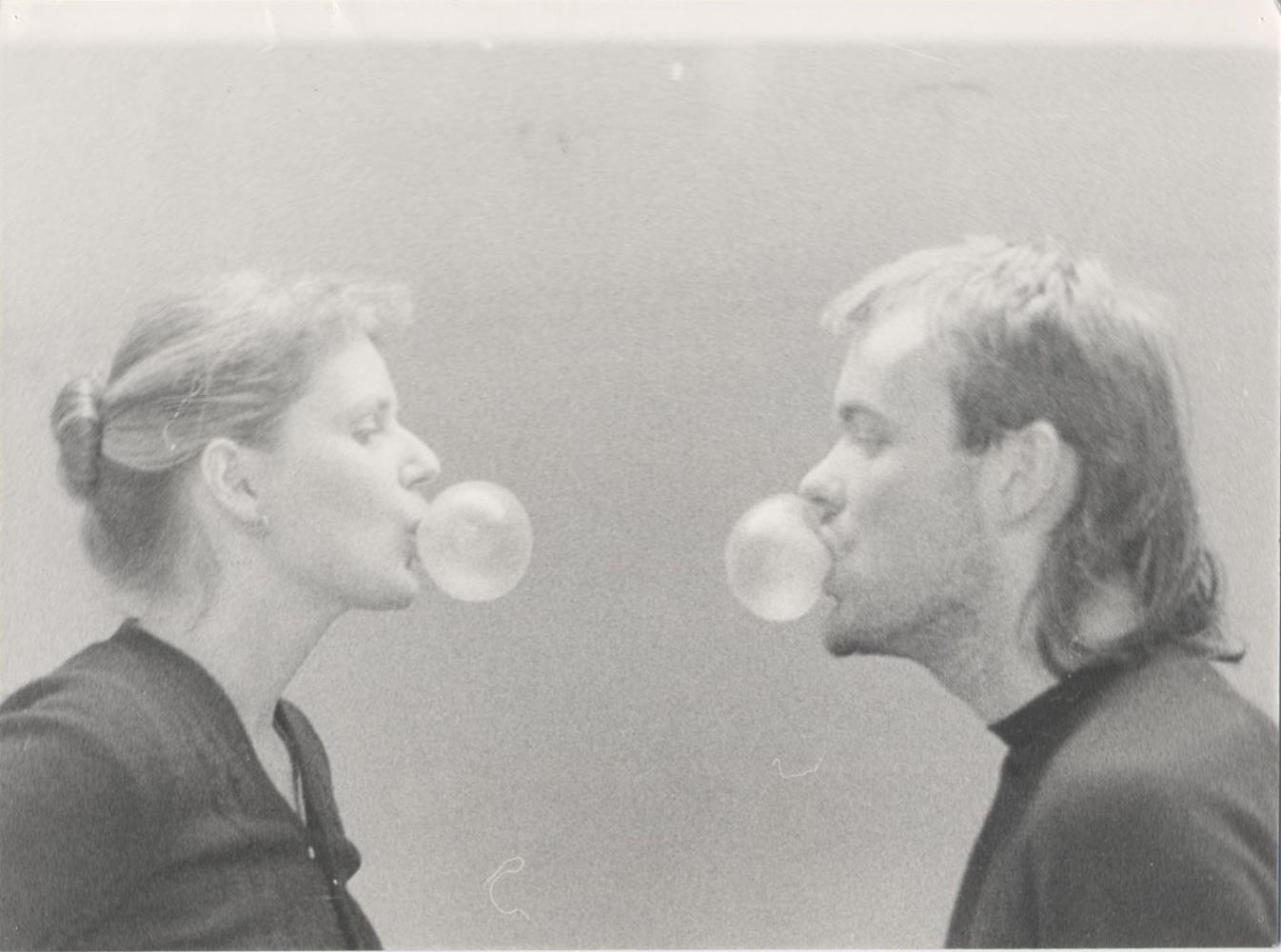 Á mynd standa kona og maður á móti hvort öðru og blása tyggjókúlu.