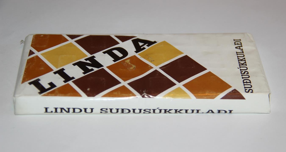Súkkulaðistykkið er pakkað í hvítan pappír með brúnu munstri. Texti: Linda suðusúkkulaði.