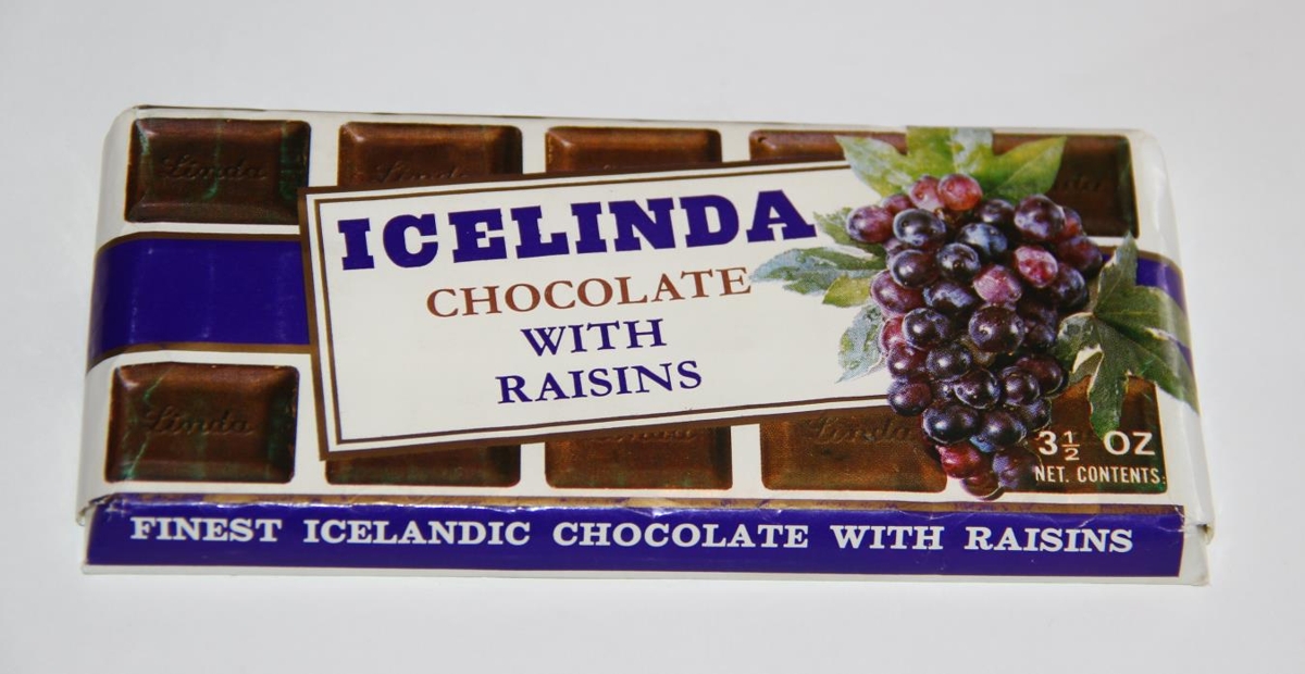 Umbúðir um stykkið eru í bláum og brúnum litum. Merking: Icelinda - Chocolate with raisins. 3 1/2 oz net contents. Finest Icelandic chocolate with raisins