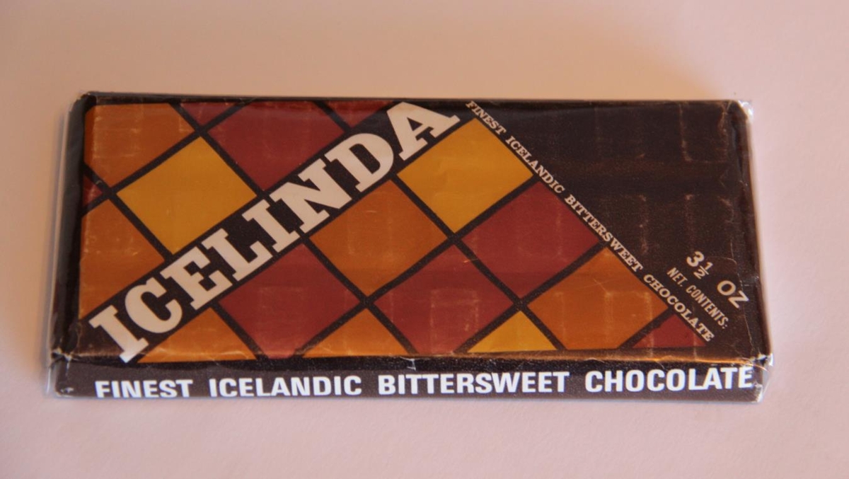 Stykkið er pakkað í brúnan pappír. Merking: Icelinda - Finest Icelandic bittersweet chocolate. 3 1/2 oz net contents. First Icelandic bittersweet chocolate.