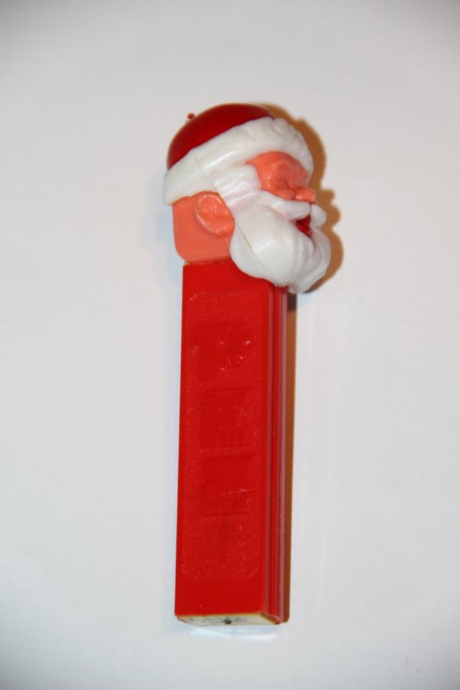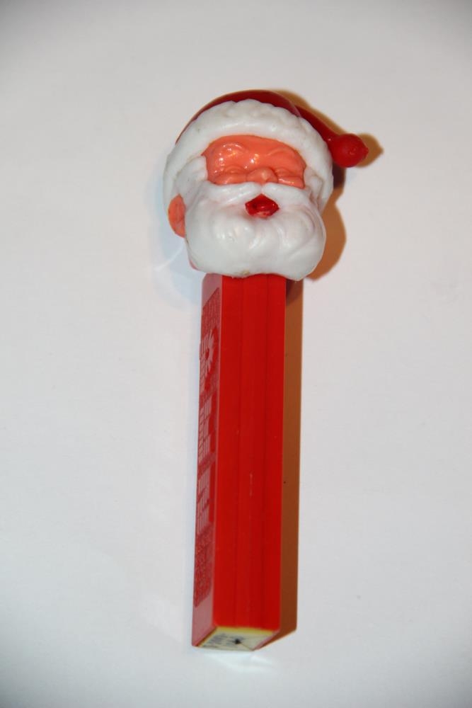 Pez-karlinn: Rautt hulstur fyrir Pez-töflur, með jólasveinahöfði í rauðu, bleiku og hvítu. Í hulstrinu er gormur sem þrýstir alltaf næstu töflu upp að hausnum; sem er hallað afturábak til að ná töflunni. Upphleypt letur: Pez.