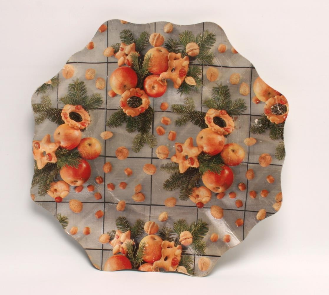 Grár jólabakki með myndum af greni, eplum, hnetum og smákökum.